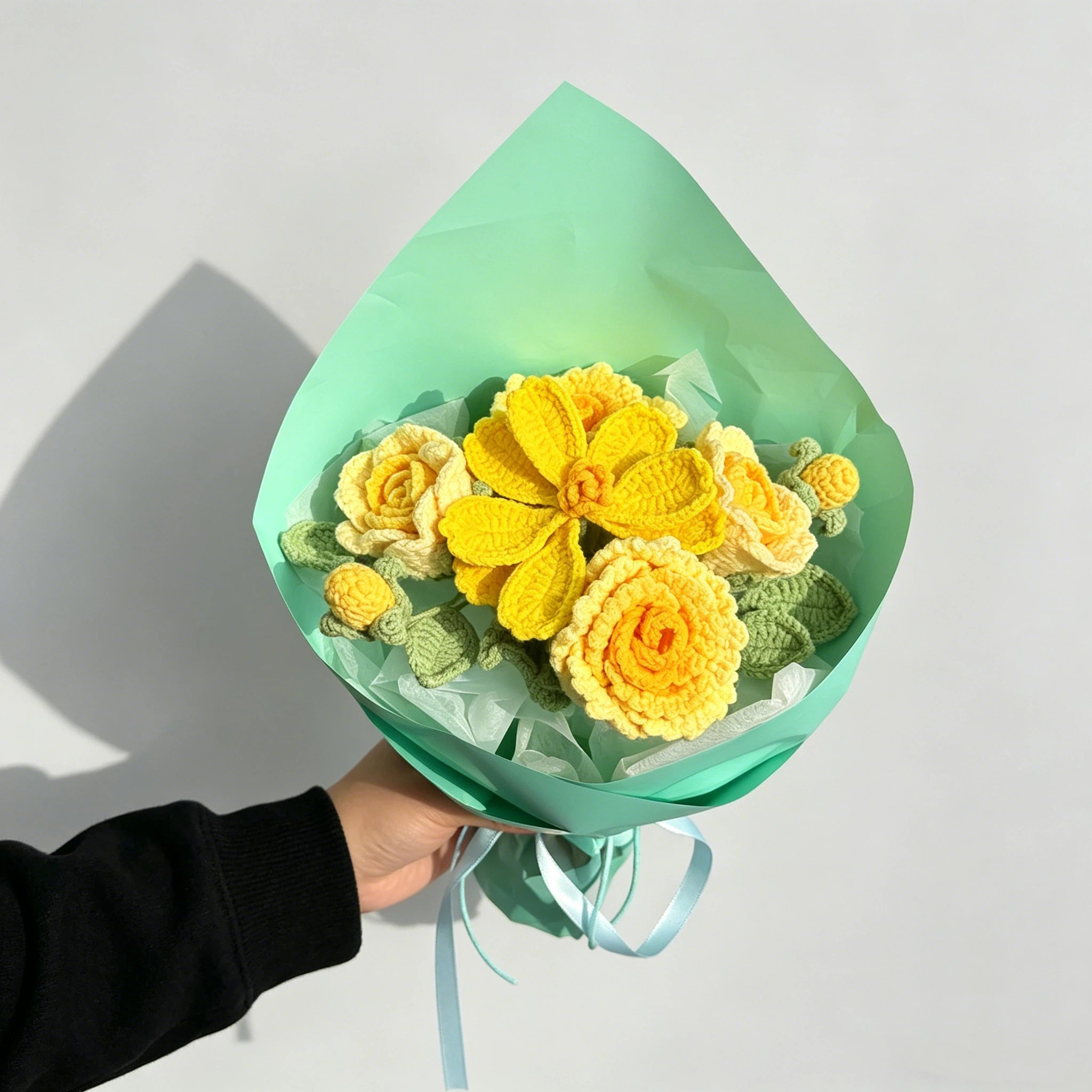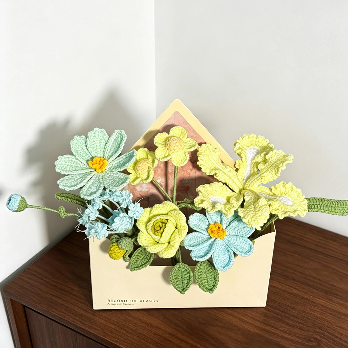 Mint Yellow Crochet Envelope Flower Bouquet, Handmade Knit Forever Floral Gift