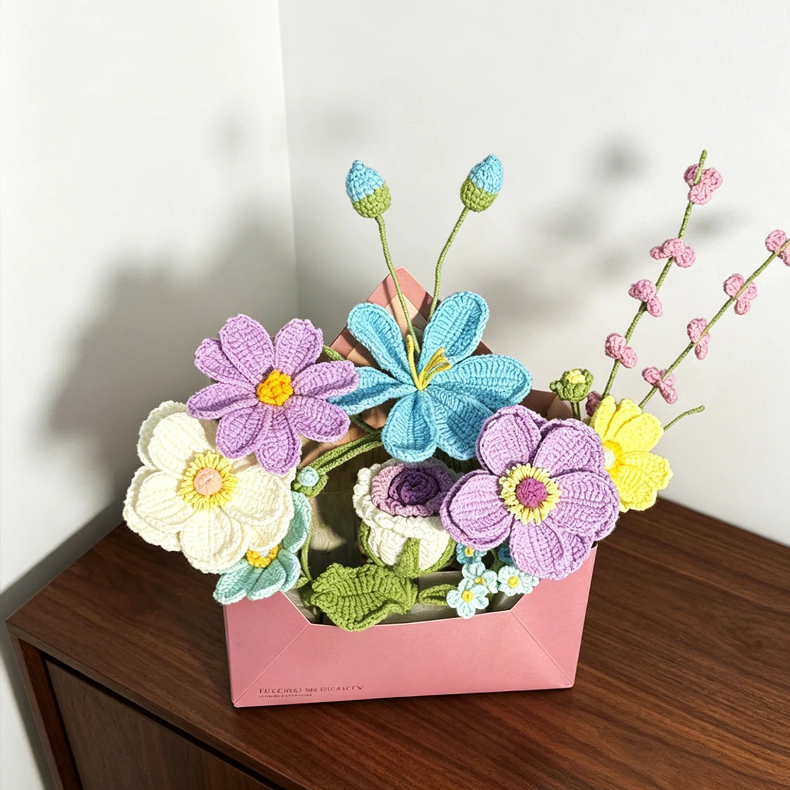 Pastel Crochet Envelope Flower Bouquet, Forever Handmade Knit Floral Decor