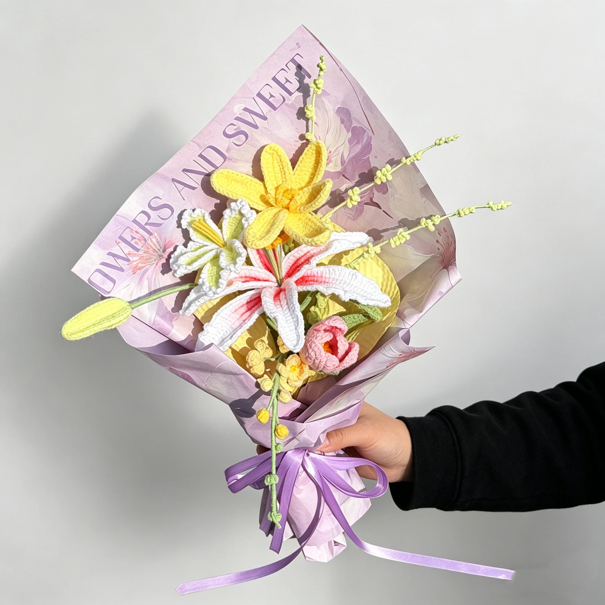 Pastel Purple Handmade Crochet Lily & Tulip Bouquet, Eternal Knitted Flower Gift For Her, Forever Preserved Floral Arrangement