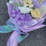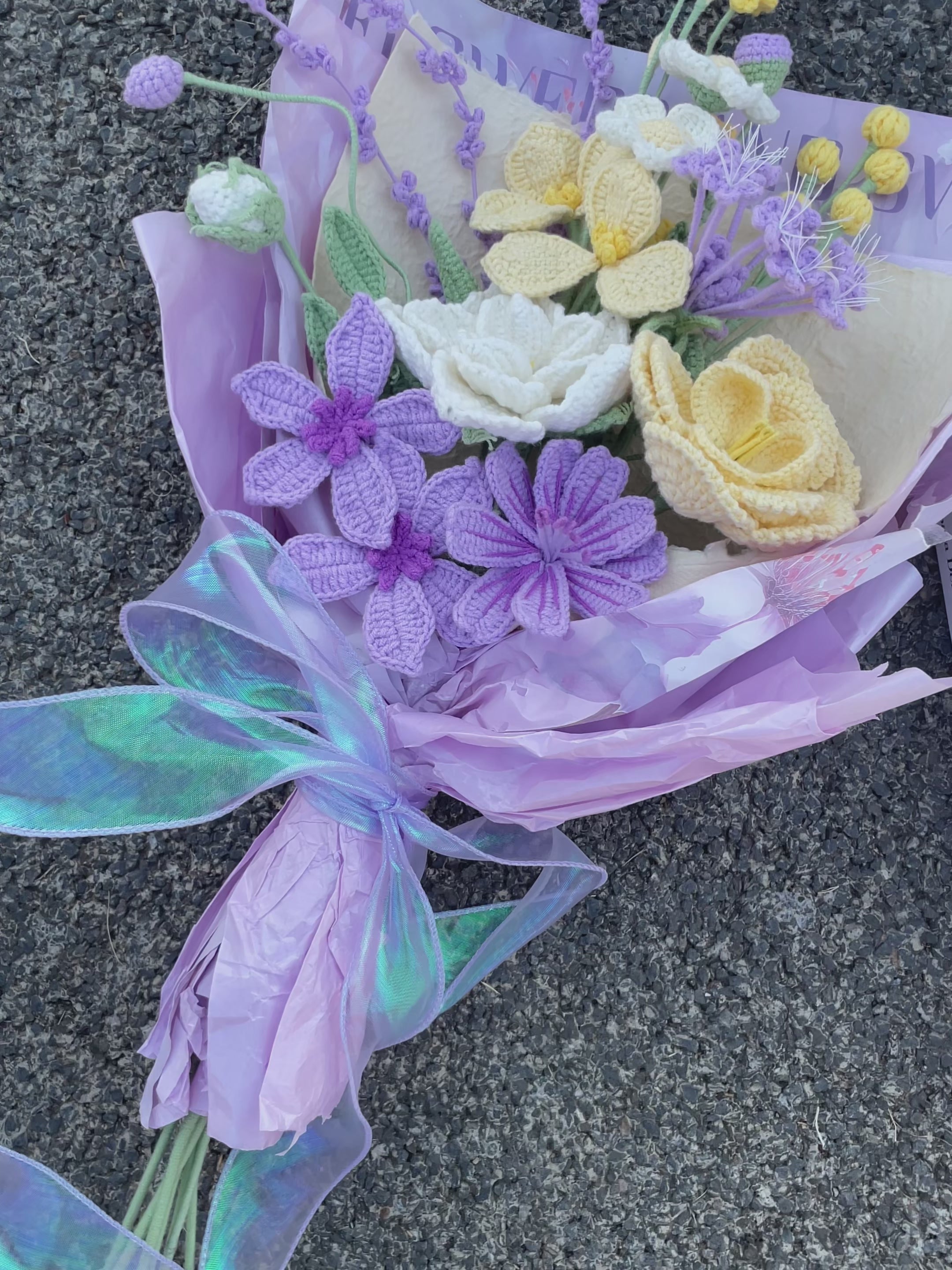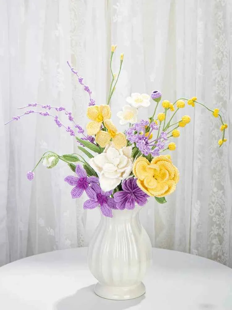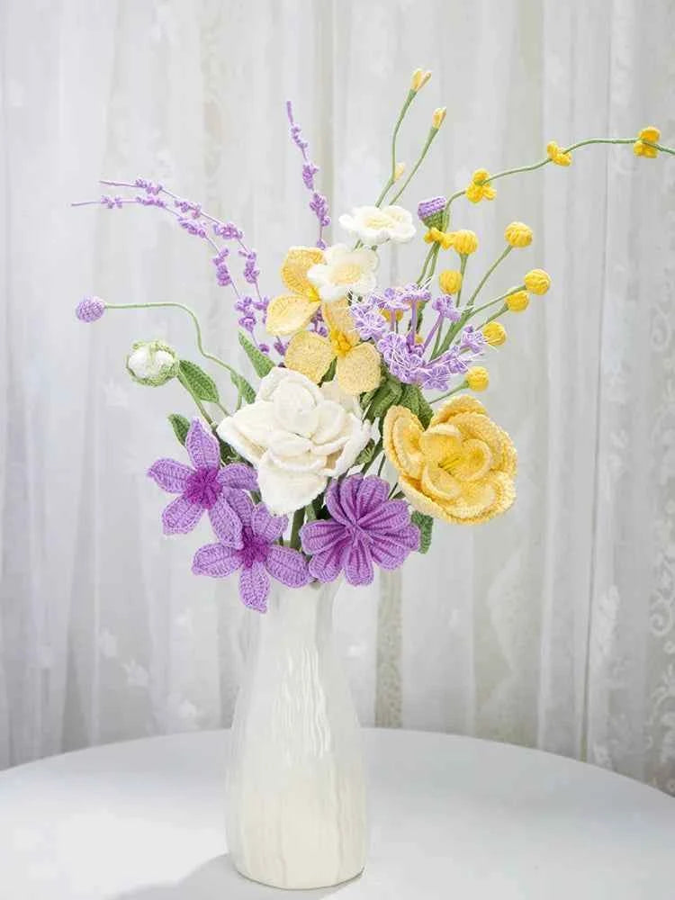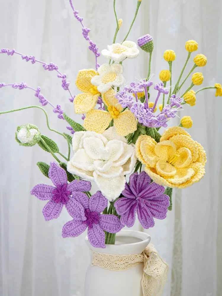 Bring everlasting beauty into your life with this handmade crochet flower bouquet. Each flower is carefully crafted from soft, high-quality yarn and arranged into a charming pastel bouquet that will never fade or wilt. Featuring delicate roses, daisies, and wildflowers in soothing lavender, cream, and soft yellow tones, this bouquet adds a warm and romantic touch to any space.